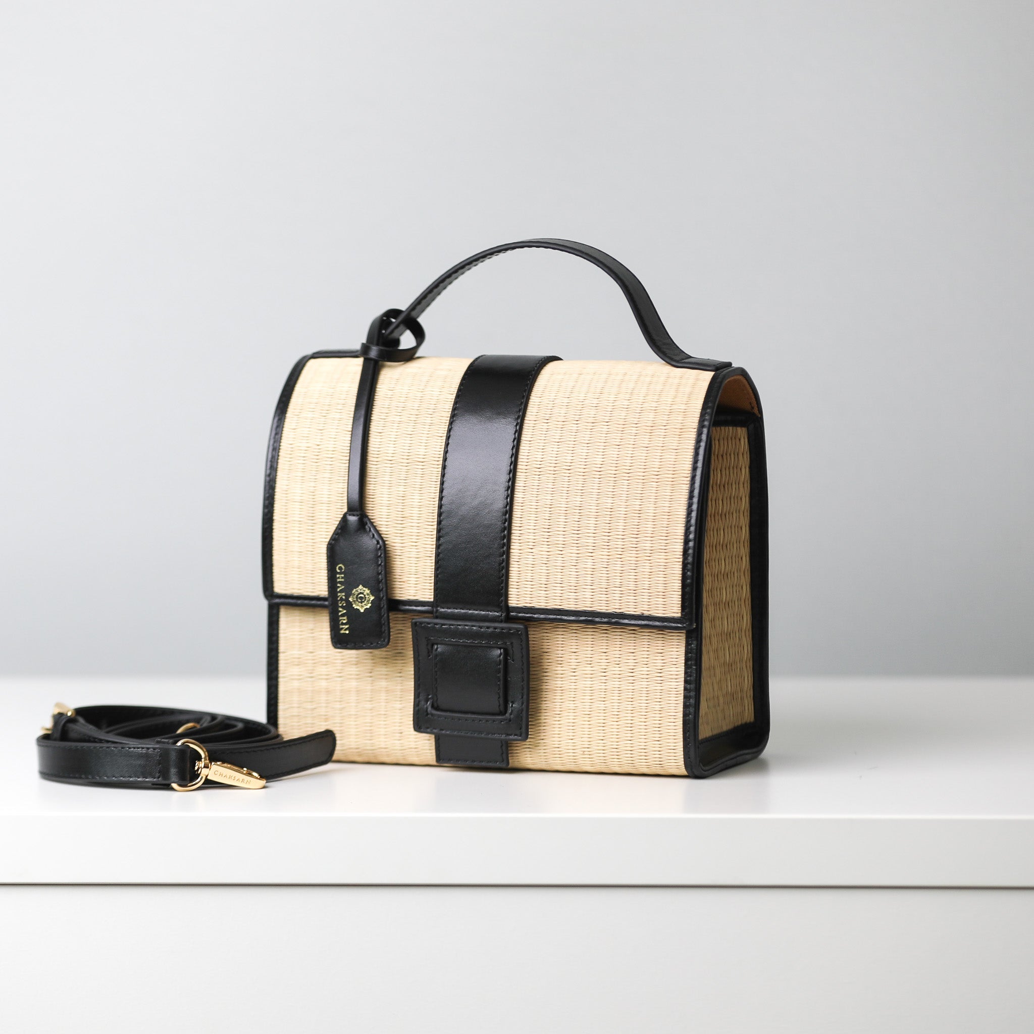 Chaksarn Candy bag is a wicker bag from natural water sedge (or sea grass) and genuine leather. The bag is made almost entirely from durable water sedge hand-woven by local villagers in Thailand. The woven sedge is then edged and stitched with coloured cowhide leather by experienced craftsman.